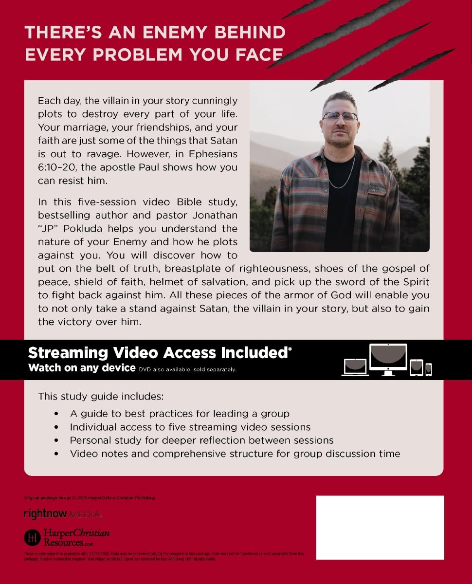 In this five-session video Bible study, bestselling author and pastor Jonathan "JP" Pokluda helps you understand the nature of your Enemy and how he plots against you. You will discover how to put on the belt of truth, breastplate of righteousness, shoes of the gospel of peace, shield of faith, helmet of salvation, and pick up the sword of the Spirit to fight back against him. All these pieces of the armor of God will enable you to not only take a stand against Satan, the villain in your story, but also to gain the victory over him.